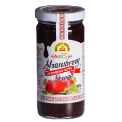 Ingrediente: capsuni organice 50%, concentrat de mere organic, agent de gelifiere: pectina, regulator de aciditate: suc de lamaie organic. Preparat din 50 g de fructe la 100 g de produs. Continut total de zahar 48g la 100g.Contine zaharuri naturale.