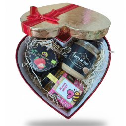 Cutie eleganta din carton rosu lucios, in forma de vinima, cu capac auriu si funda rosie contine: 1 borcan Dulceata bio de Capsuni 240g, 1 borcan pasta naturala de susan 250g si 1 borcan miere cruda de salcam 250g (la cerere se poate adapta in functie de dorinta)